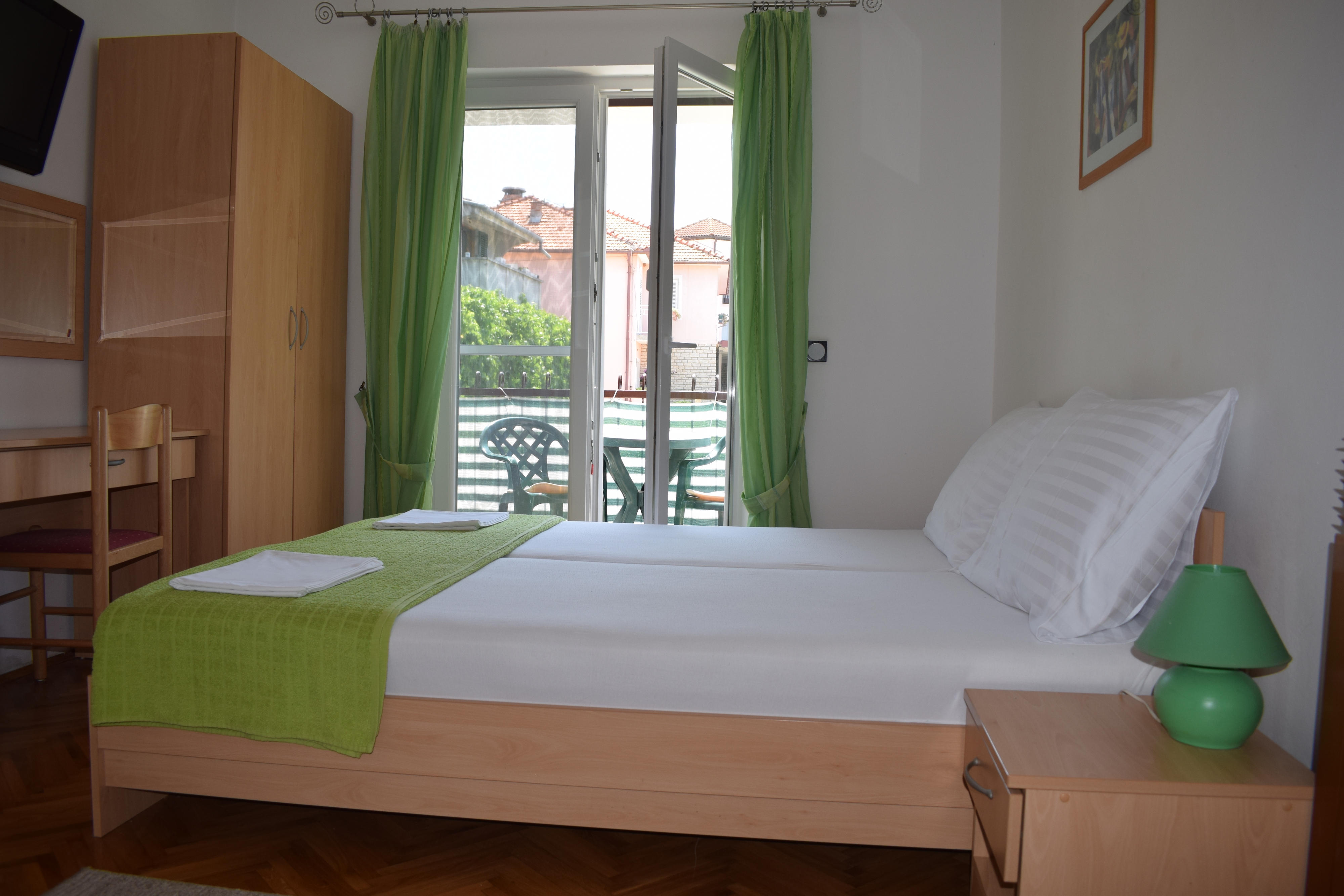 Studio flat can accommodate 2 guests. Beds are situated in 1 sleeping rooms, within 16m2. Guests can use a private balcony to enjoy the warm summer evenings. Food can be prepared using barbecue which is shared with other guests too. INCLUDED IN THE PRICE: tourist tax, final cleaning, air-conditioning, internet. OBLIGATORY ADDITIONAL COSTS: short stay fee (surcharge depending on a number of booked nights: 30% - 1, 20% - 2, 10% - 3). The availability of additional services for your chosen dates of stay, as well as their prices (if none are listed) must be checked ahead of time. Any additional services not shown in the price calculation are payable directly to the property owner and only if used by the visitor. Discounts to the base price: free day 14=13 (for reservations of 14 or more days you get one free day for the stay until 31122026).