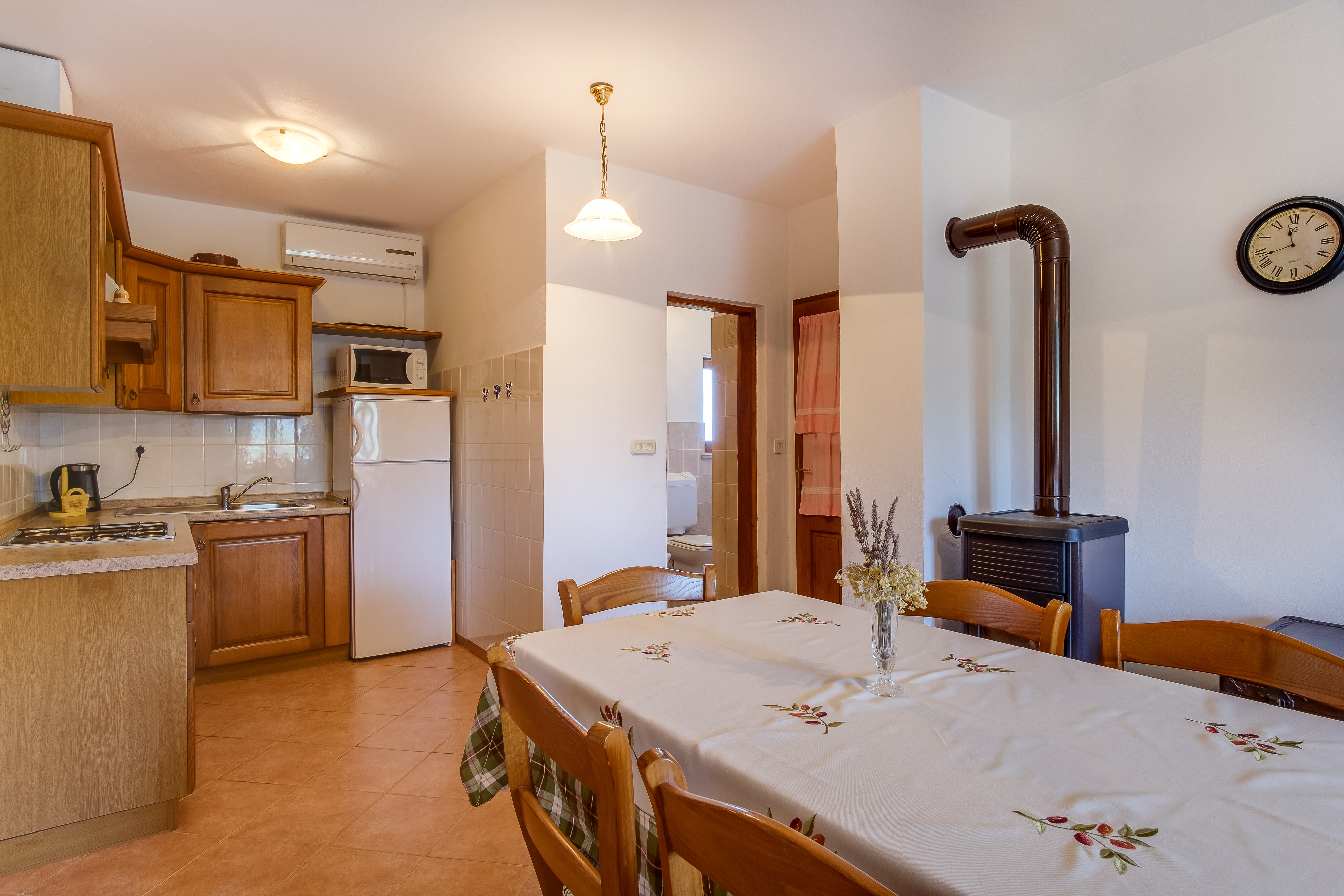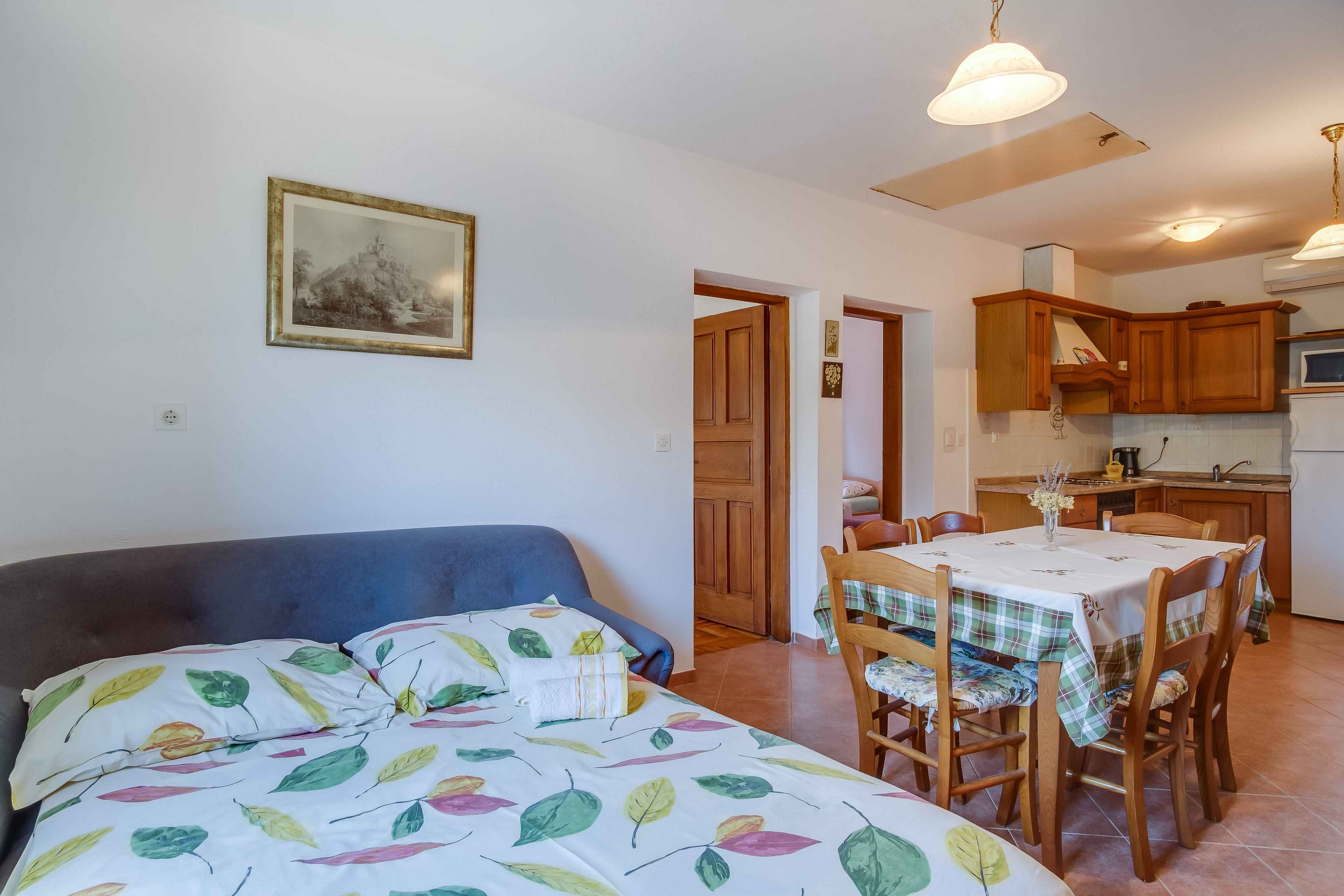 Apartment can accommodate 5 guests. Beds are situated in 2 sleeping rooms, but also in the dining room, within 48m2. Food can be prepared using barbecue which is shared with other guests too. There is no balcony or terrace in the reserved accommodation unit. INCLUDED IN THE PRICE: tourist tax, final cleaning, air-conditioning, central heating, parking, internet, laundry, baby cot, iron, ironing board, hairdryer. OBLIGATORY ADDITIONAL COSTS: short stay fee (surcharge depending on a number of booked nights: 30% - 1, 20% - 2, 10% - 3). The availability of additional services for your chosen dates of stay, as well as their prices (if none are listed) must be checked ahead of time. Any additional services not shown in the price calculation are payable directly to the property owner and only if used by the visitor.