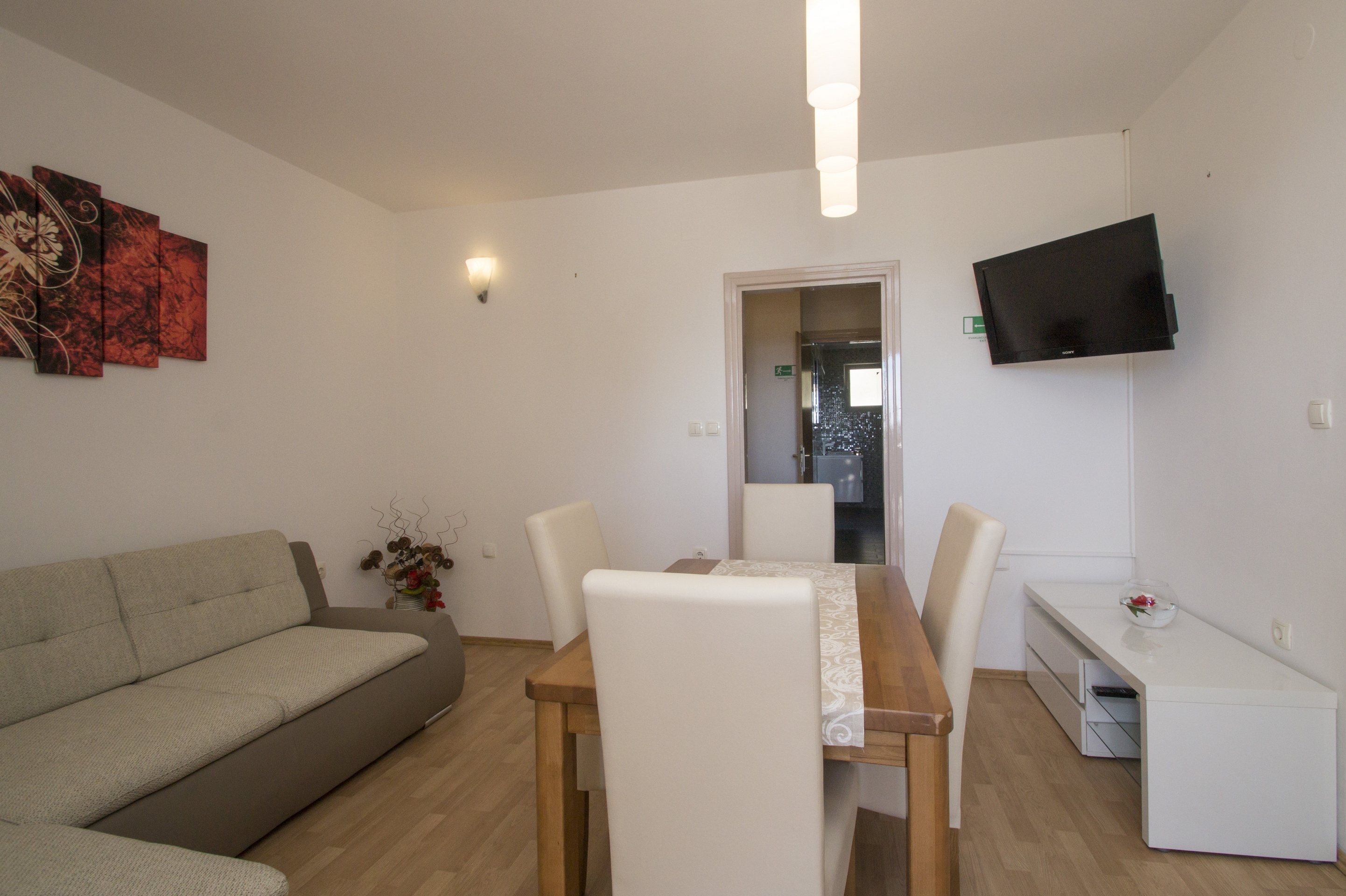 Apartment can accommodate 5 guests. Beds are situated in 2 sleeping rooms, but also in the dining room, within 64m2. Guests can use a private terrace to enjoy the warm summer evenings. The apartment offers the sea view. Food can be prepared using barbecue which is shared with other guests too. Shared pool is on disposal during stay. For the booked accommodation unit the deposit is paid directly to the owner upon check-in (deposit amount is displayed on the website) INCLUDED IN THE PRICE: tourist tax, final cleaning, air-conditioning, pool, parking, internet, baby cot, iron, ironing board, hairdryer. OBLIGATORY ADDITIONAL COSTS: deposit (€50.00 one-time payment). The availability of additional services for your chosen dates of stay, as well as their prices (if none are listed) must be checked ahead of time. Any additional services not shown in the price calculation are payable directly to the property owner and only if used by the visitor. Discounts to the base price: free day 14=13 (for reservations of 14 or more days you get one free day for the stay until 31122026).