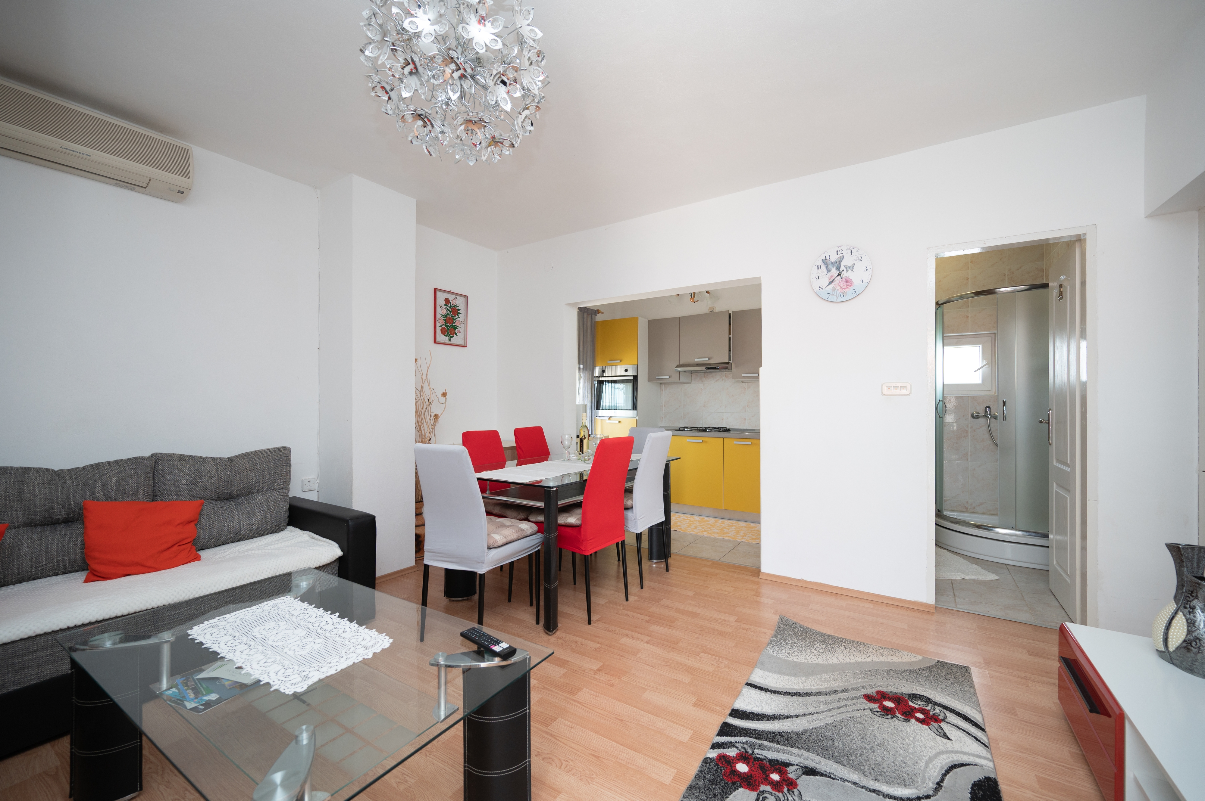 Apartment can accommodate 5 guests. Beds are situated in 2 sleeping rooms, but also in the living room, within 45m2. Guests can use a private terrace to enjoy the warm summer evenings. Food can be prepared using barbecue which is shared with other guests too. INCLUDED IN THE PRICE: tourist tax, final cleaning, air-conditioning, parking, internet, baby cot, additional bed, iron, ironing board, hairdryer. OBLIGATORY ADDITIONAL COSTS: short stay fee (surcharge depending on a number of booked nights: 30% - 1, 20% - 2, 10% - 3). The availability of additional services for your chosen dates of stay, as well as their prices (if none are listed) must be checked ahead of time. Any additional services not shown in the price calculation are payable directly to the property owner and only if used by the visitor. Discounts to the base price: free day 21=19 (for reservations of 21 or more days you get 2 free days for the stay until 31122026).