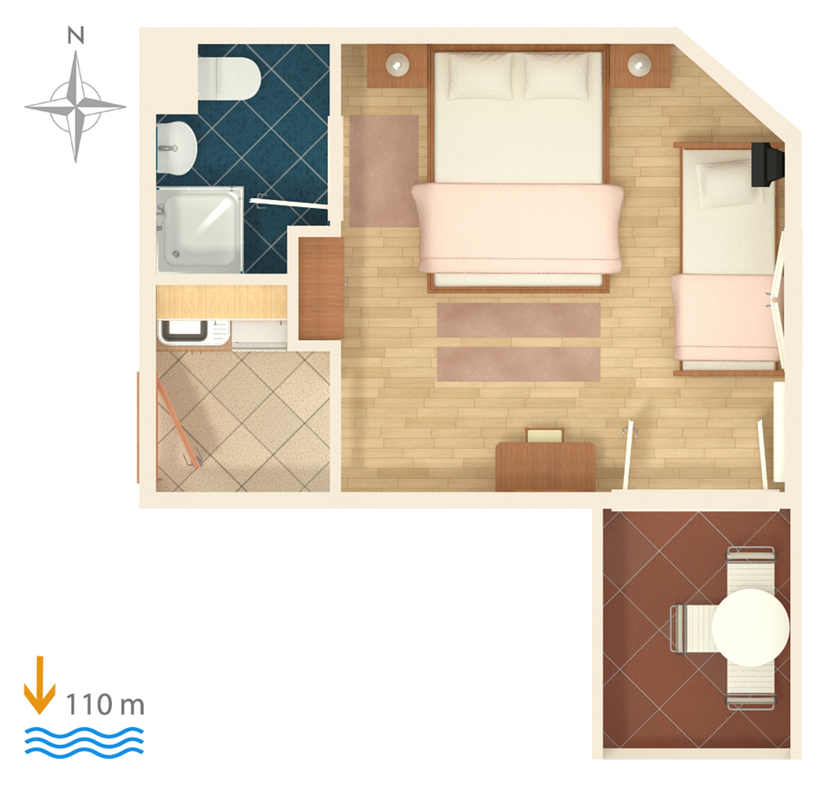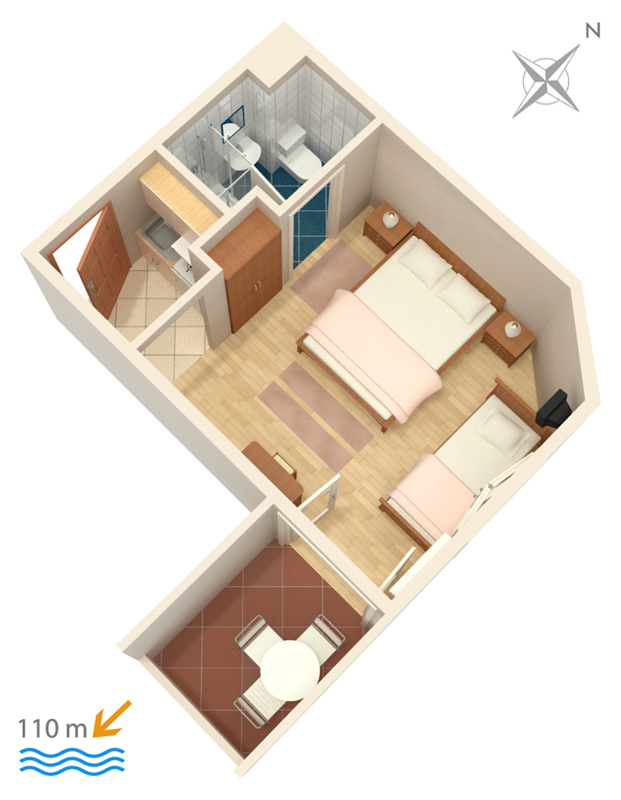 Studio flat can accommodate 3 guests. Beds are situated in 1 sleeping rooms, within 21m2. Guests can use a private terrace to enjoy the warm summer evenings. The studio offers the sea view. Food can be prepared using barbecue which is shared with other guests too. INCLUDED IN THE PRICE: tourist tax, final cleaning, air-conditioning, parking, internet, laundry, iron, ironing board, hairdryer. OBLIGATORY ADDITIONAL COSTS: short stay fee (surcharge depending on a number of booked nights: 30% - 1, 20% - 2, 10% - 3). OPTIONAL ADDITIONAL COSTS: central heating (€3.00 per night), additional bed (€5.00 per night). The availability of additional services for your chosen dates of stay, as well as their prices (if none are listed) must be checked ahead of time. Any additional services not shown in the price calculation are payable directly to the property owner and only if used by the visitor.
