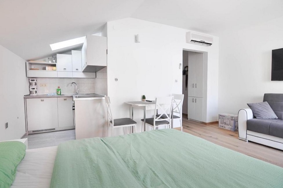 Studio flat can accommodate 2 guests. Beds are situated in 1 sleeping rooms, within 26m2. Guests can use a private balcony to enjoy the warm summer evenings. The studio offers the sea view. INCLUDED IN THE PRICE: tourist tax, final cleaning, air-conditioning, parking, internet. The availability of additional services for your chosen dates of stay, as well as their prices (if none are listed) must be checked ahead of time. Any additional services not shown in the price calculation are payable directly to the property owner and only if used by the visitor. Discounts to the base price: free day 14=13 (for reservations of 14 or more days you get one free day for the stay until 31122026).