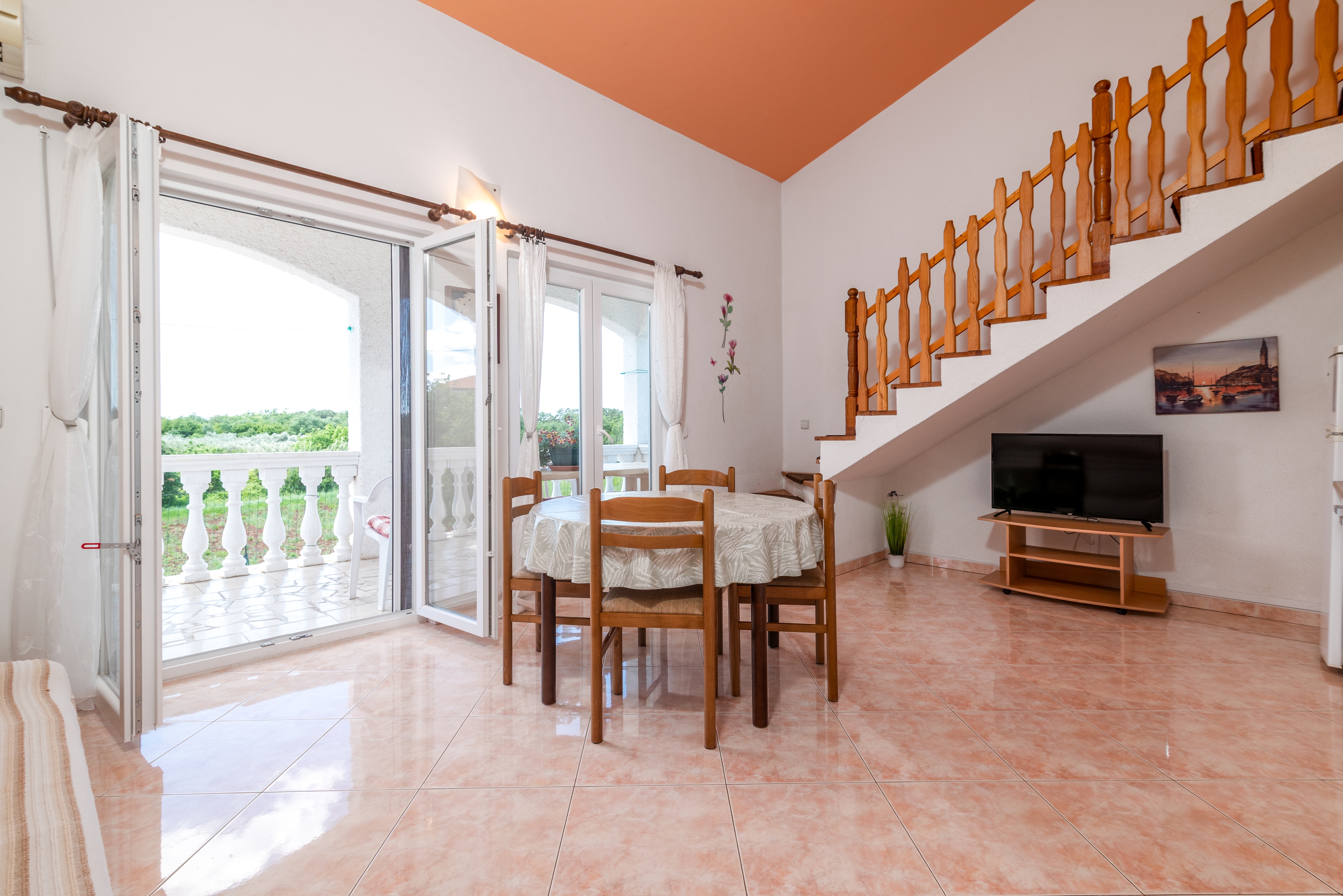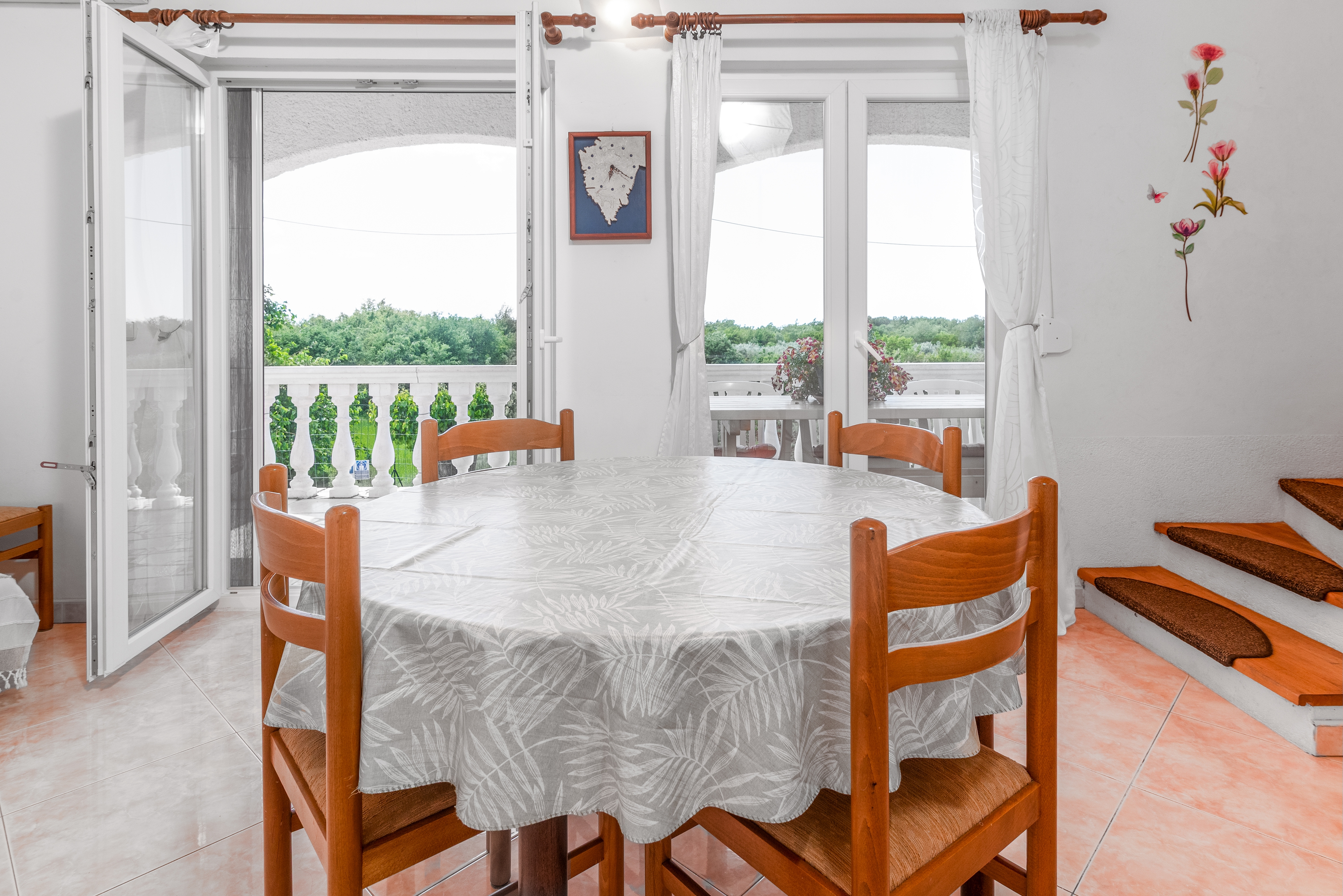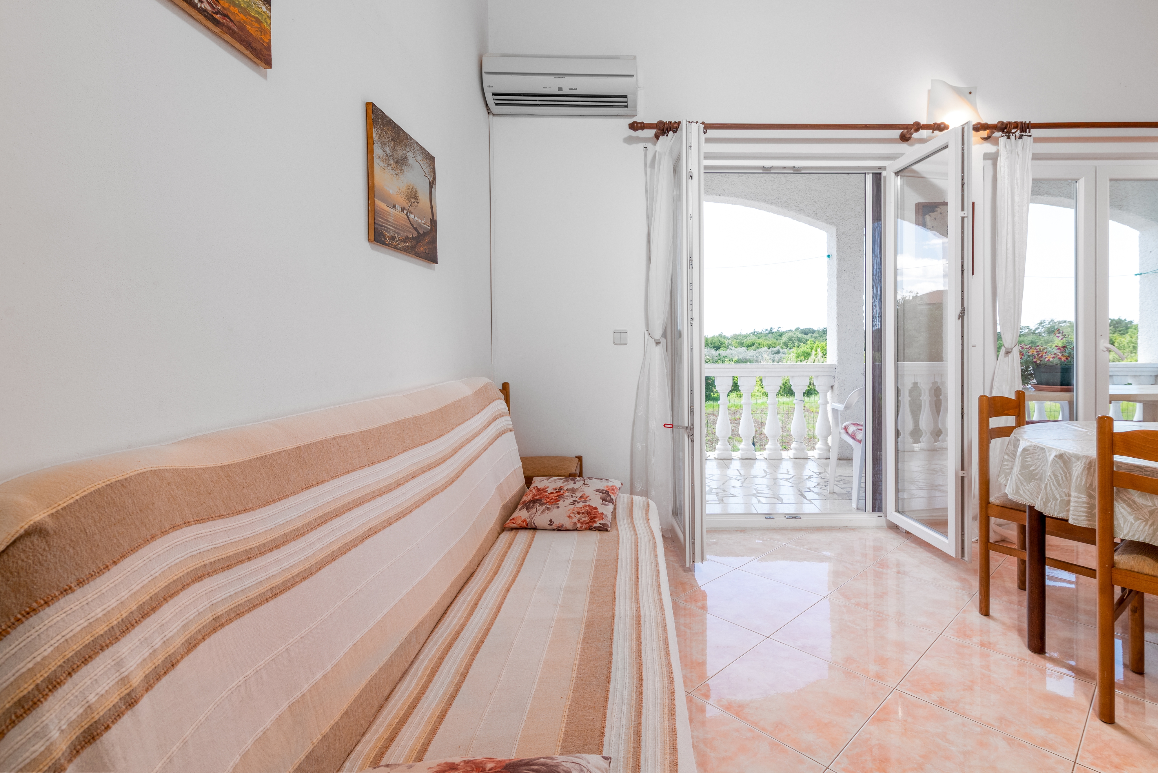 Apartment can accommodate 6 guests. Beds are situated in 2 sleeping rooms, but also in the living room, within 65m2. Guests can use a private terrace to enjoy the warm summer evenings. Food can be prepared using barbecue which is shared with other guests too. Shared pool is on disposal during stay. This accommodation unit welcomes pets at an additional charge. For the booked accommodation unit the deposit is paid directly to the owner upon check-in (deposit amount is displayed on the website) INCLUDED IN THE PRICE: tourist tax, final cleaning, air-conditioning, pool, parking, internet, baby cot, iron, ironing board, hairdryer, portable barbecue, sunshade, sunchairs. OBLIGATORY ADDITIONAL COSTS: deposit (€100.00 one-time payment). OPTIONAL ADDITIONAL COSTS: laundry (€5.00 washing), pets (€10.00 per night). The availability of additional services for your chosen dates of stay, as well as their prices (if none are listed) must be checked ahead of time. Any additional services not shown in the price calculation are payable directly to the property owner and only if used by the visitor. Discounts to the base price: free day 14=13 (for reservations of 14 or more days you get one free day for the stay until 31122026).