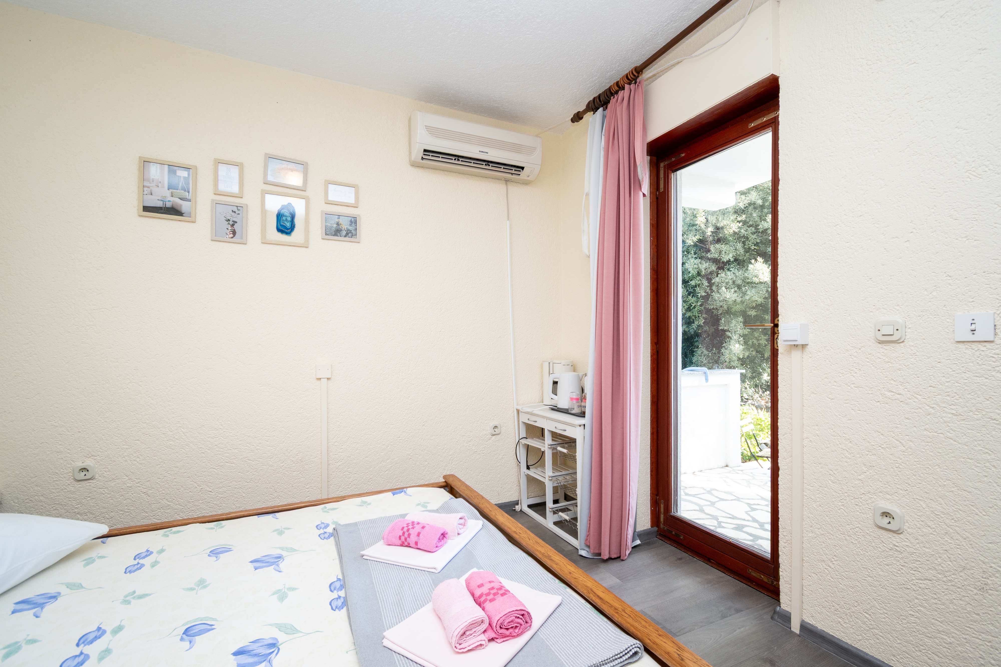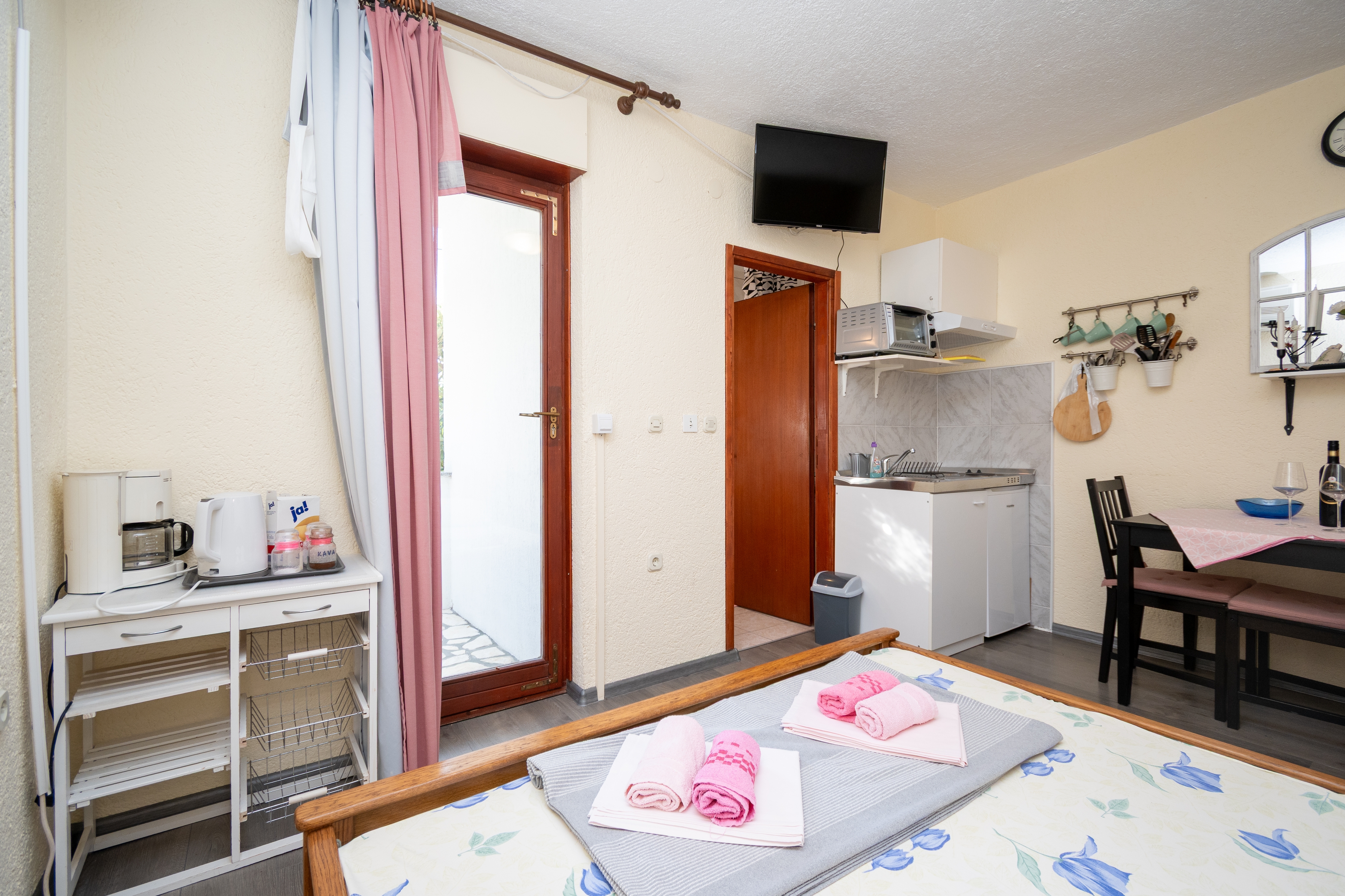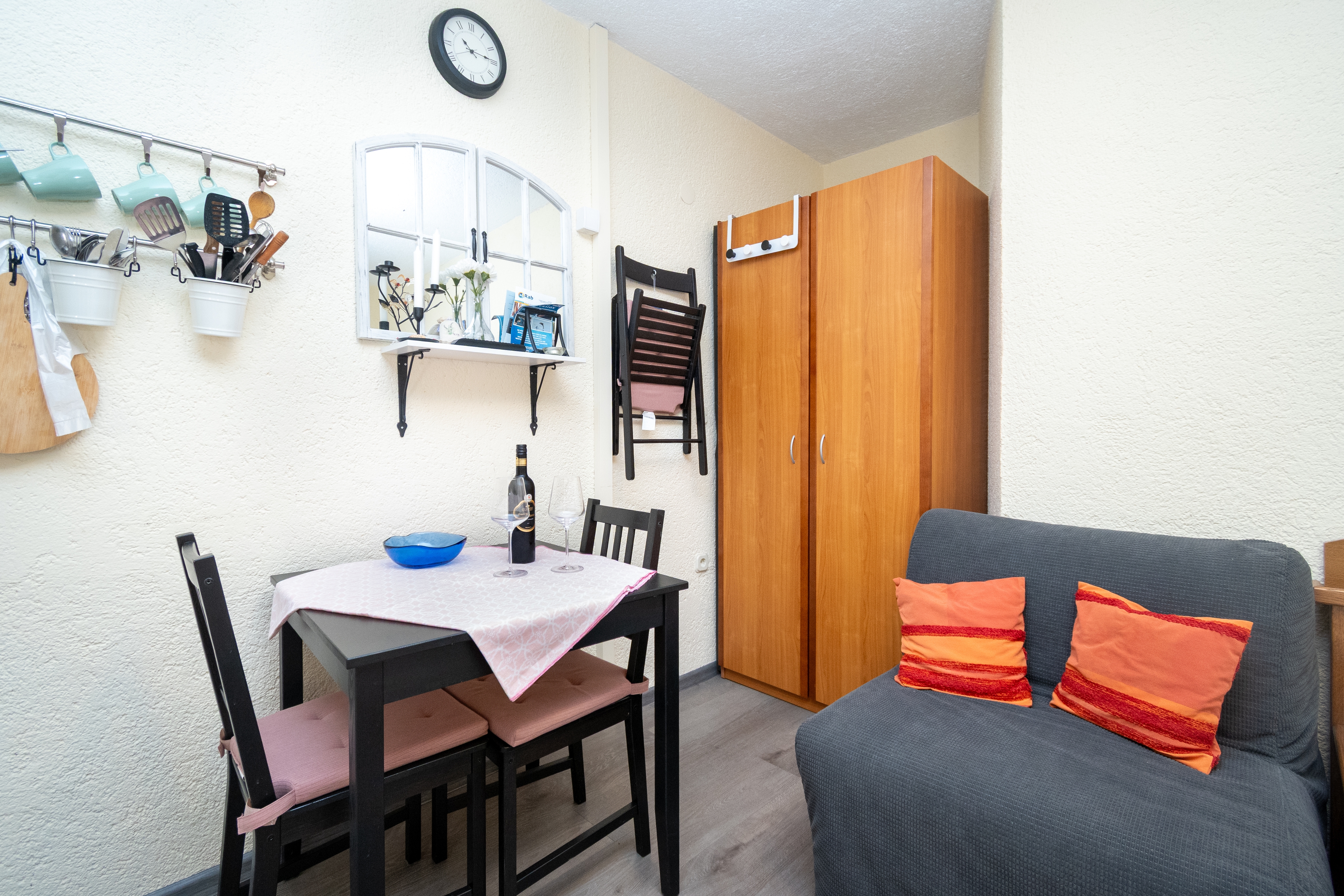 Studio flat can accommodate 2 guests. Beds are situated in 1 sleeping rooms, within 19m2. Guests can use a private terrace to enjoy the warm summer evenings. Food can be prepared using barbecue which is shared with other guests too. INCLUDED IN THE PRICE: tourist tax, final cleaning, parking, internet, iron, ironing board. OBLIGATORY ADDITIONAL COSTS: short stay fee (surcharge depending on a number of booked nights: 30% - 1, 20% - 2, 10% - 3). OPTIONAL ADDITIONAL COSTS: air-conditioning (€5.00 per night), laundry (€5.00 washing). The availability of additional services for your chosen dates of stay, as well as their prices (if none are listed) must be checked ahead of time. Any additional services not shown in the price calculation are payable directly to the property owner and only if used by the visitor.