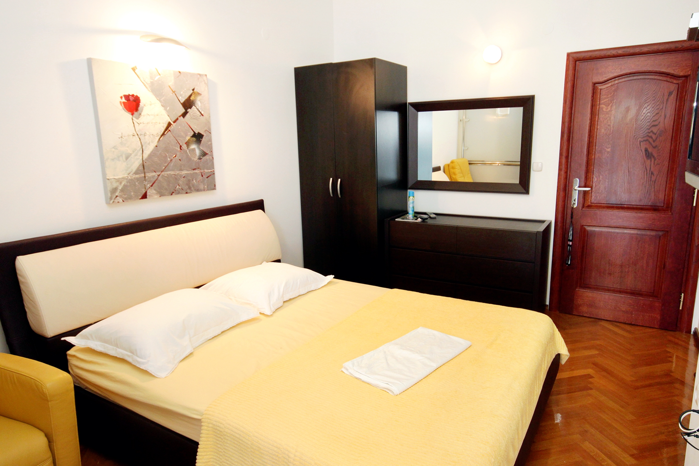 Studio flat can accommodate 2 guests. Beds are situated in 1 sleeping rooms, within 17m2. Guests can use a private terrace to enjoy the warm summer evenings. The studio offers the sea view. Food can be prepared using barbecue which is shared with other guests too. Shared pool is on disposal during stay. INCLUDED IN THE PRICE: tourist tax, final cleaning, air-conditioning, central heating, pool, parking, internet, laundry, baby cot, ironing board, hairdryer. OBLIGATORY ADDITIONAL COSTS: short stay fee (surcharge depending on a number of booked nights: 30% - 1, 20% - 2, 10% - 3). The availability of additional services for your chosen dates of stay, as well as their prices (if none are listed) must be checked ahead of time. Any additional services not shown in the price calculation are payable directly to the property owner and only if used by the visitor.