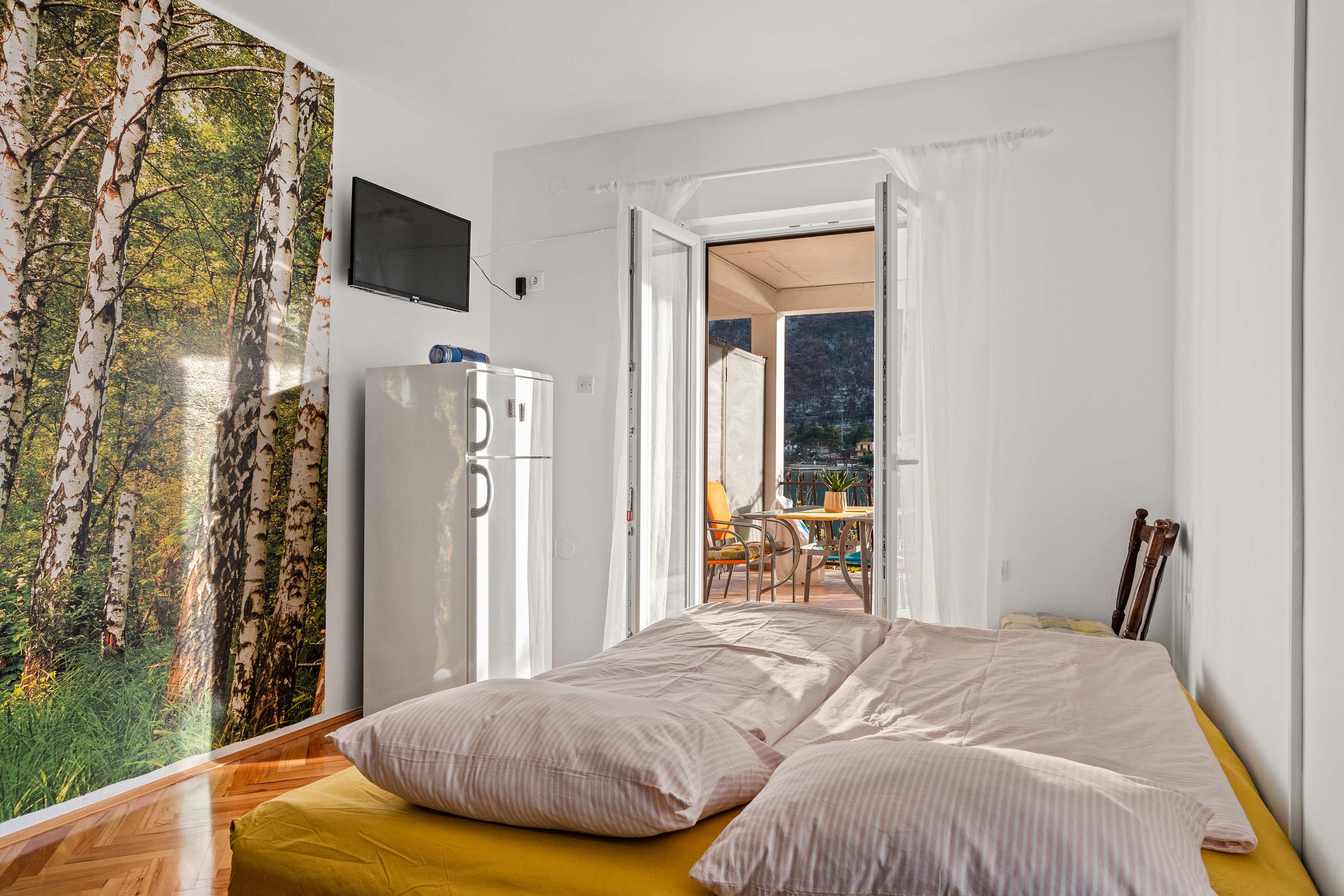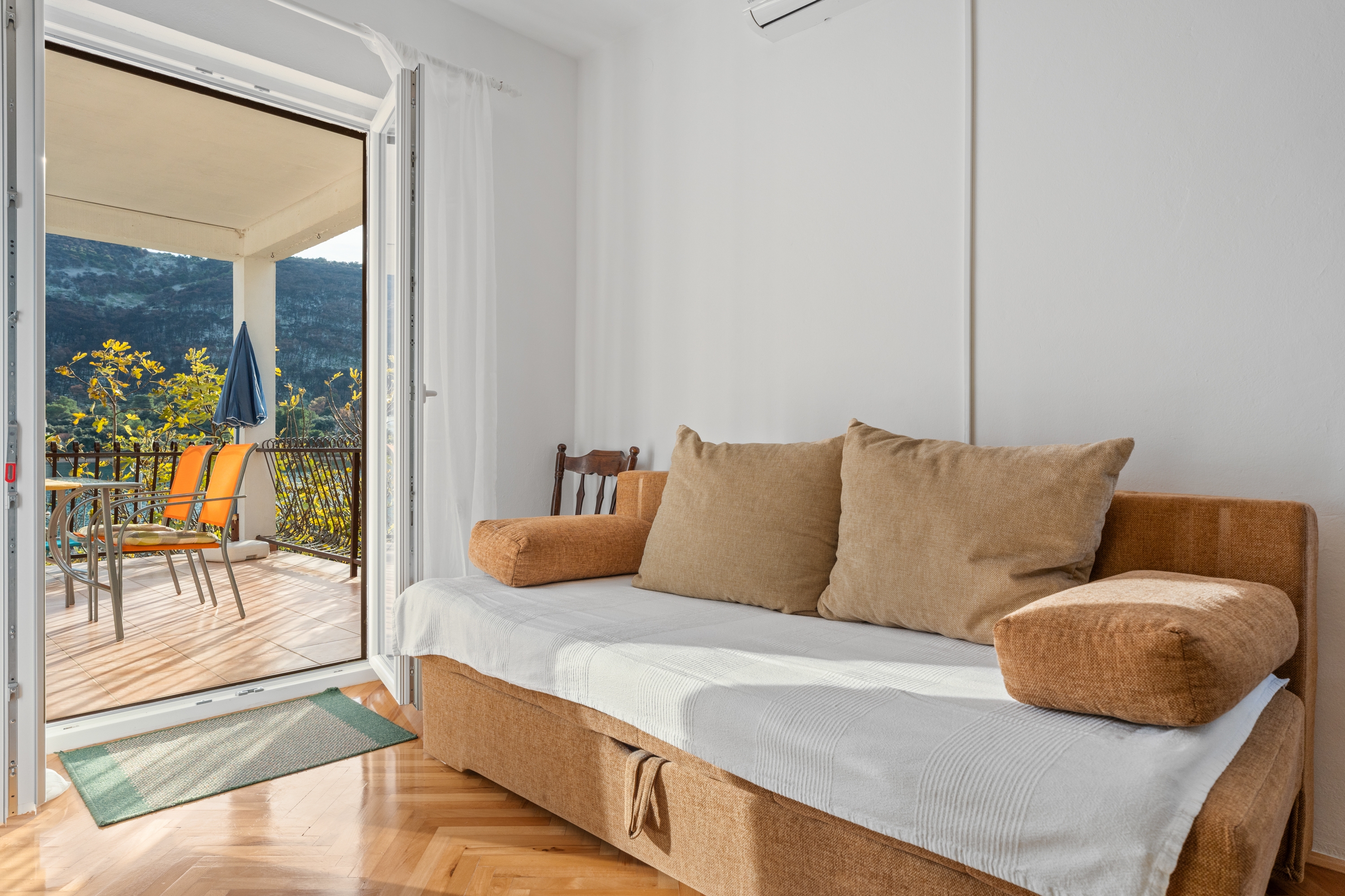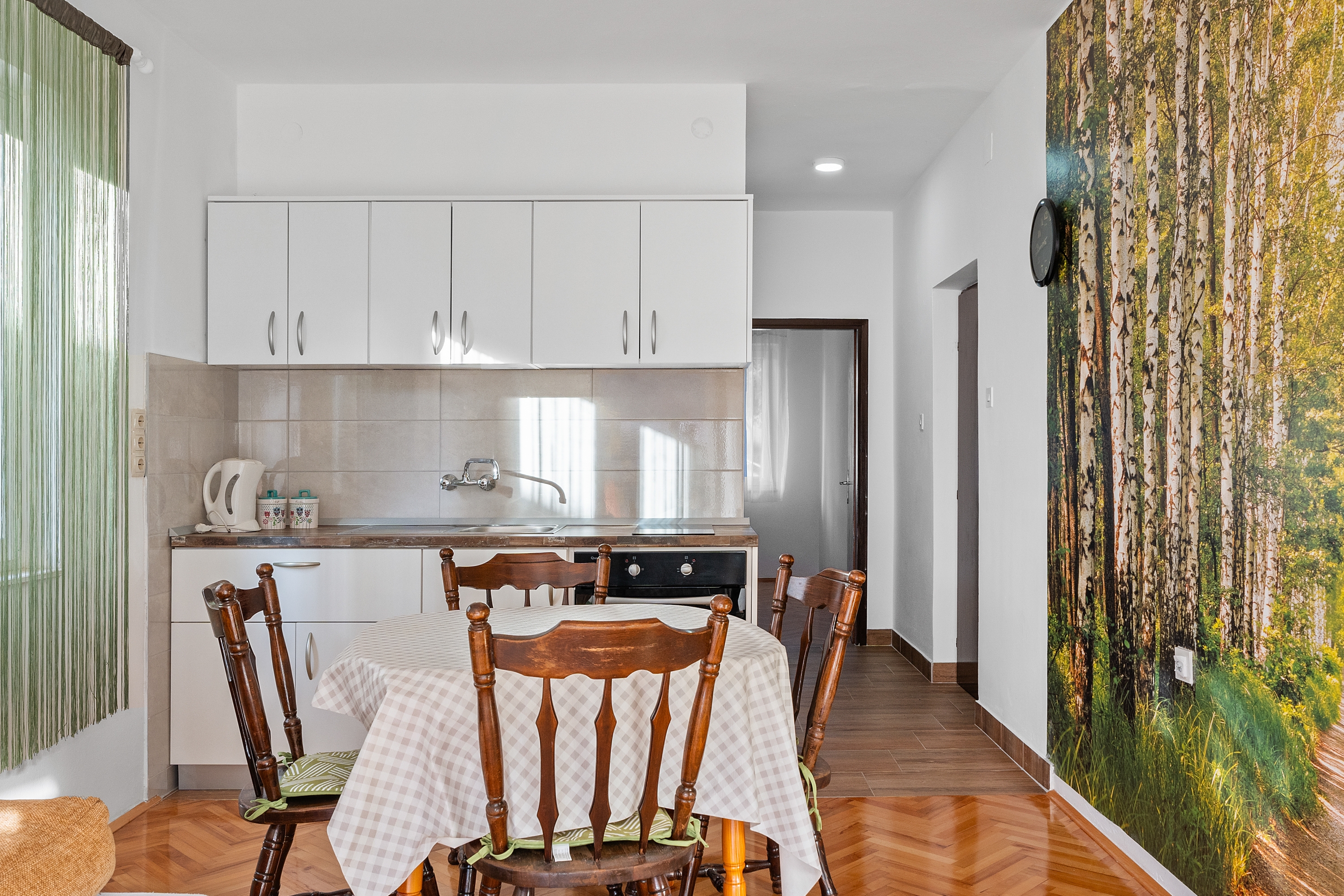 Apartment can accommodate 4 guests. Beds are situated in 1 sleeping rooms, but also in the living room, within 43m2. Guests can use a private terrace to enjoy the warm summer evenings. The apartment offers the sea view. Food can be prepared using barbecue which is shared with other guests too. INCLUDED IN THE PRICE: tourist tax, final cleaning, air-conditioning, parking, internet, iron, hairdryer, portable barbecue, sunshade, sunchairs. OBLIGATORY ADDITIONAL COSTS: short stay fee (surcharge depending on a number of booked nights: 30% - 1, 20% - 2, 10% - 3). The availability of additional services for your chosen dates of stay, as well as their prices (if none are listed) must be checked ahead of time. Any additional services not shown in the price calculation are payable directly to the property owner and only if used by the visitor. Discounts to the base price: free day 14=13 (for reservations of 14 or more days you get one free day for the stay until 31122026).