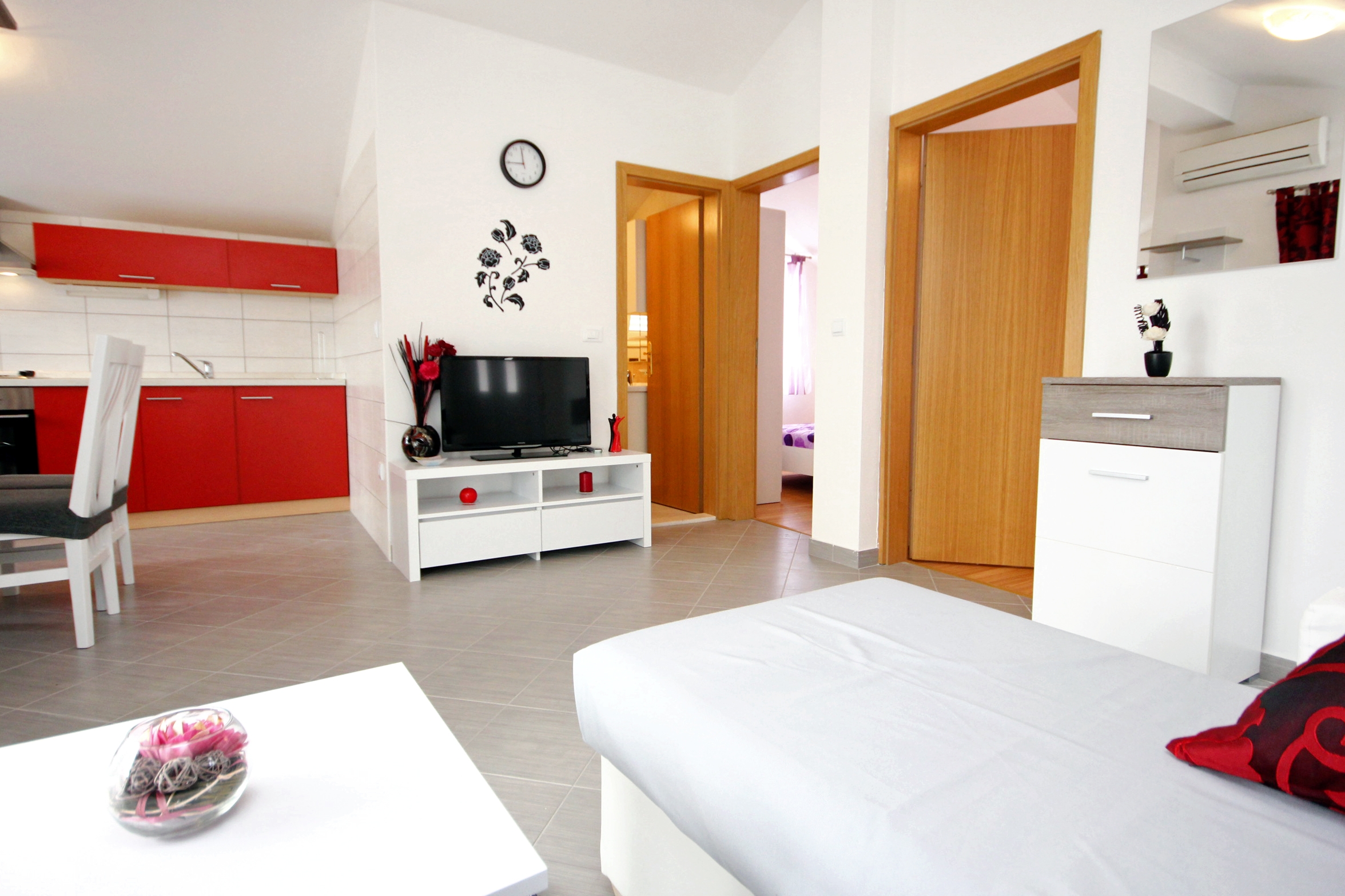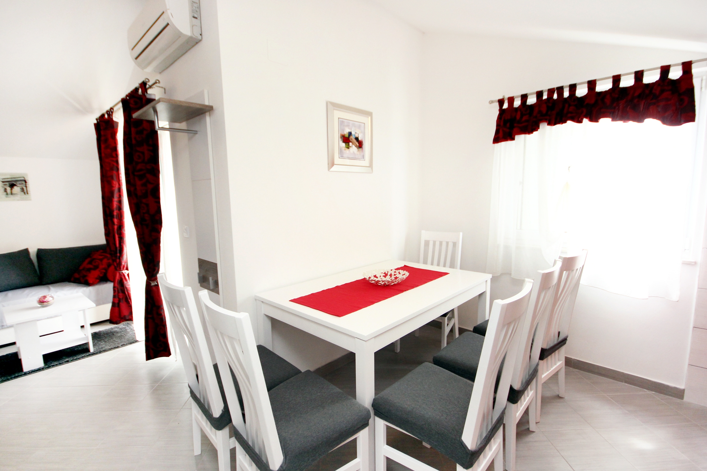 Apartment can accommodate 5 guests. Beds are situated in 2 sleeping rooms, but also in the living room, within 44m2. Guests can use a private terrace to enjoy the warm summer evenings. Food can be prepared using barbecue which is shared with other guests too. INCLUDED IN THE PRICE: tourist tax, final cleaning, air-conditioning, parking, internet. OBLIGATORY ADDITIONAL COSTS: short stay fee (surcharge depending on a number of booked nights: 30% - 1, 20% - 2, 10% - 3). The availability of additional services for your chosen dates of stay, as well as their prices (if none are listed) must be checked ahead of time. Any additional services not shown in the price calculation are payable directly to the property owner and only if used by the visitor.